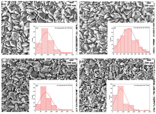 FE-SEM images and particle size distribution histograms of (a) LaFeO3, (b) LaMnO3, (c) LaCrO3, and (d) LaNiO3 thin films with the corresponding grain size distribution (e–h), respectively.