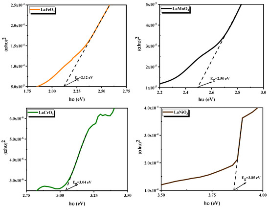 where represents the absorption coefficient, is the photon energy, is a constant, and determines the type of transition. For direct transitions, , whereas for indirect transitions, [27]. The absorption coefficient was determined using the following relation: