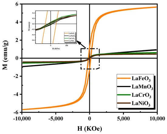 Nevertheless, a weak ferromagnetic behavior observed in , , and films is attributed to the fact that lanthanum is unable to completely cancel out all the magnetization caused by the dipoles of , , and atoms [37]. Indeed, the magnetic properties can be influenced by several factors, including size, sample shape, crystallinity, synthesis method, magnetization direction, and annealing temperature [38].