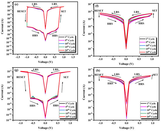 To characterize the electrical performance of the devices, the I-V characteristics were measured. Prior to conducting I-V measurements, it is necessary to perform an electroforming process in order to establish a strong electric field and initiate a controlled breakdown of the switching layer within the device. This process leads to the introduction of numerous oxygen vacancies into the active layer, which subsequently forms nanoscale conductive filaments. Thus, to prevent the device from being permanently damaged, the applied voltage is gradually increased while keeping the current below [39]. The I-V characteristics of the devices were measured during a DC voltage sweep of and the obtained curves are depicted in Figure 9a–d. As shown, all memory devices exhibit uniform bipolar RS behaviors. Furthermore, the I-V data are plotted on a semilogarithmic scale to clearly study the RS behavior of the device, as depicted in Figure 9e–h. The fabricated devices are initially in their HRS when the voltage sweeps from to . When the voltage sweeps from to , they switch from a HRS to a LRS in positive voltage. This transition results in a nonvolatile “ON” state, known as the “Set” process. Subsequently, the devices revert to a HRS from a LRS after the voltage sweeps from to and then returns from to , realizing the “OFF” state. This reverse transition is referred to as the “reset” process and is defined by the negative voltage.