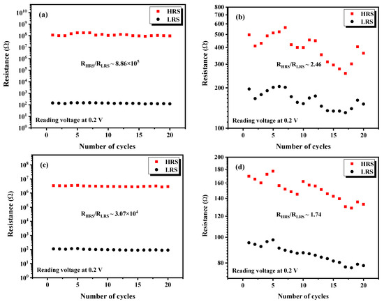 To evaluate the performance of the fabricated devices, an endurance test was conducted. Figure 10 shows changes in resistance for the LRS and HRS states with a reading voltage of during 20 consecutive sweep cycles. Remarkably, the devices based on and displayed remarkable stability in switching between HRS and LRS throughout the 20 cycles, demonstrating reproducible read/write characteristics. Conversely, the devices based on and exhibit poor endurance characteristics with some fluctuations.