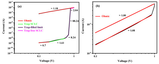 Finally, beyond this transition region, a distinct behavior is observed for and . For , a region with a slope of is observed. In this region, all traps are completely filled, and they no longer have any effect on charge injection. As a result, any injected charge fully contributes to the current, following an ideal trap-free square law (). This behavior has been reported in previous studies [45,49]. On the other hand, for , a different region is observed, characterized by a slope of , indicating an Ohmic conduction by the linear relationship between the applied voltage and the resulting current.