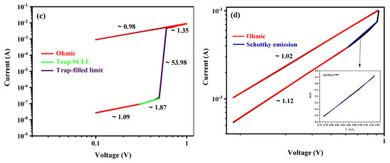 After applying a higher voltage, a significant increase in current is observed around and for and , respectively. This abrupt change in current behavior can be attributed to the saturation of all traps by the injected charge carriers, resulting in a steep slope increase from approximately two to infinity (). This phenomenon is associated with the formation of filaments and the filling up of all-trap sites. In this state, the injected charge carriers are able to move freely across the active layer thickness, leading to a rapid change in current and ultimately bringing it to the LRS [36,46,49]. Thus, trap-controlled SCLC conduction mechanisms become dominant in these devices.