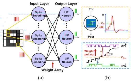 Brain-inspired SNNs are considered to have great potential to support low-power neural computing tasks [8,9,10]. In particular, SNNs have been demonstrated to be an effective algorithmic foundation for efficient processing of temporal signals [11,12]. The complex dynamical properties of these networks play a crucial role in reducing the memory resources necessary for processing, recognizing and classifying extended sequences of temporal data [13,14,15]. Figure 1a depicts a typical SNN comprising neuromorphic unit circuits for pattern recognition. Each input pattern pixel is represented as a random distribution spike train with its frequency proportional to the corresponding pixel value sent to the input layer neurons of the network. Pixel information is encoded by input layer neurons and is transmitted to the output layer composed of Leaky Integrate-and-Fire (LIF) neurons via synapses. As shown at the top of Figure 1b, an LIF neuron performs leaky integration of incoming spikes through input synapses, gradually accumulating them over time and firing spikes only when its membrane voltage reaches the threshold voltage VTH, where VTH denotes the threshold at which the LIF neuron reaches a firing spike. After spiking, the membrane potential of the LIF neuron resets to its resting state. The intelligent source of SNNs is that each synaptic weight can be modified through learning algorithms. Spike Driven Synaptic Plasticity (SDSP) is a biologically plausible learning rule optimized from the well- known Hebbian algorithm mechanism [16]. The weight pull-up process, complying with SDSP regulations, is illustrated in Figure 1b below. Under the control of UP or DN digital signals, the weight undergoes changes until a predetermined voltage threshold (Vthw) is reached, triggering a rapid transition to a stable value. The change in synaptic weight between previous and subsequent moments is indicated as ∆W. Specifically, UP and DN signals are generated by monitoring the firing frequency of postsynaptic neurons and the stimulation time of presynaptic neurons.