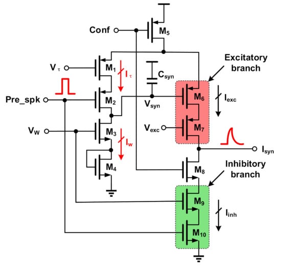 The excitatory (M6–7) and inhibitory (M9–10) synapses are voltage-controlled current sources that are activated by a presynaptic pulse (Pre_spk) and weight (Vw). The attributes of the synapses can be configured according to actual needs through the digital signal Conf to control transistors M5 and M8. Transistor M1 acts as a constant current source to the linearly charged capacitor Csyn, while M6 generates an excitatory current exponentially dependent on the Vsyn node and M7 adjusts the magnitude of the excitatory current via bias voltage Vexc. Transistors M9–10 generate inhibitory synaptic exponential current to discharge neurons’ membrane potentials. Taking the excitatory synapse as an example, based on the linear transmission principle, the synapse obeys the following dynamics: