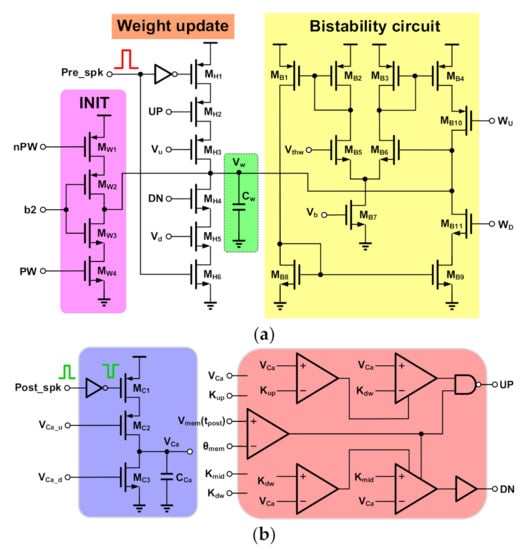 In Figure 4a, MH1–H6 comprise a spike-triggered weight update block. When spikes from presynaptic neurons are received, it increases or decreases synaptic weight Vw depending on the digital signals UP and DN generated downstream by the postsynaptic neuron. Up and down jumps height of weight can be adjusted by changing the Vu and Vd signals. A bi-stability weight refresh circuit comprised of MB1–B11 is a wide-range positive-feedback transconductance amplifier with a low slew rate that continuously compares the Vw node with the threshold voltage Vthw. If Vw > Vthw, the amplifier slowly drives the Vw node toward the positive rail; otherwise, it actively drives it toward the ground. The drift rates to high and low states can be tuned with bias voltage WU and WD, respectively. The bi-stable property effectively implements the LIP and LTD mechanisms’ process for weight updates and eliminates the problematic requirement of storing precise analog variables for synapses at long time scales. In addition, the INIT block MW1–4 can be used to set the initial state of the synapse weight: when the write (PW) signal stays high, the weight Vw is shorted to Vdd or toward the ground according to bit b2.