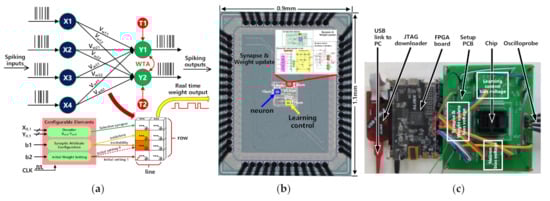- Frenkel, C.; Lefebvre, M.; Legat, J.-D.; Bol, D. A 0.086-mm2 12.7-pJ/SOP 64k-Synapse 256-Neuron Online-Learning Digital Spiking Neuromorphic Processor in 28 nm CMOS. IEEE Trans. Biomed. Circuits Syst. 2018, 20, 425. [Google Scholar] [CrossRef] [PubMed]