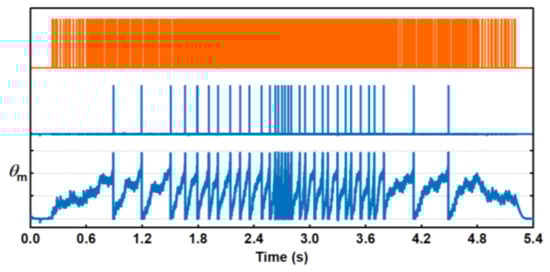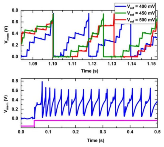 At the top of Figure 8, the membrane potential (Vmem) variation of the neuron during stimulation of an excitatory synapse with a presynaptic input spike train average frequency of 500 Hz is shown. Adjusting the bias voltage Vref in the K+ block of Figure 2 can achieve different refractory periods. Larger voltage Vref results in a longer refractory period for the neuron. Due to the voltage Vu remaining at a sufficiently high level, there is enough leakage current Iahp to discharge the neuronal membrane potential to its resting state without being affected by input stimulation. Modifying the refractory period of neurons allows for wide-ranging frequency modulation and shows great potential for larger spiking neural network systems [18,19,20,21]. The bottom of Figure 8 shows the spike-frequency adaptation behavior obtained by appropriately tuning the voltage parameters in the AHP block of Figure 2, while stimulating the neuron by a synapse applies a constant step voltage and is shown as the pink trace at the bottom. As seen, the neuron is initially firing at a high rate and gradually reaches stability at a lower rate compared to the initial firing. This adaptive frequency process reduces the firing rate to conserve energy for neurons.