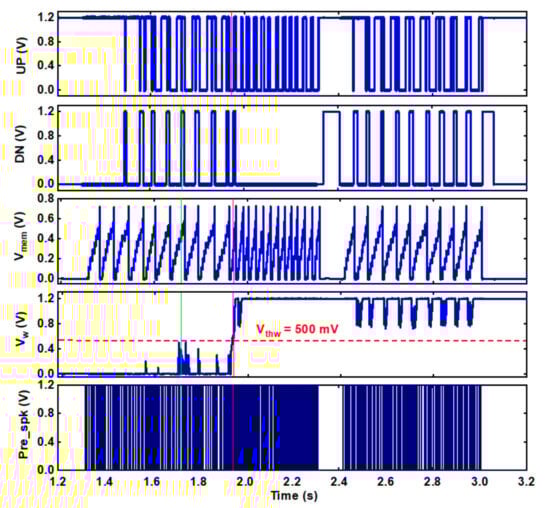 where the factor ∆w+ and ∆w− determine the amplitude of the weight Vw increases and decreases; Vmem(tpost) represents the membrane potential of the postsynaptic neuron when have presynaptic spike arrives; θmem is a set thresholds for determining whether the weight should be adjusted up or down; and the thresholds Kup, Kmid and Kdw determine the conditions under which weights can be increased, decreased, or not updated. If none of the above equation conditions are met, ∆w+ and ∆w− are nullified by setting UP to Vdd and DN to 0. This stop-learning mechanism significantly enhances the system’s ability to generalize by preventing overfitting once the input pattern has been learned [16,19,21].