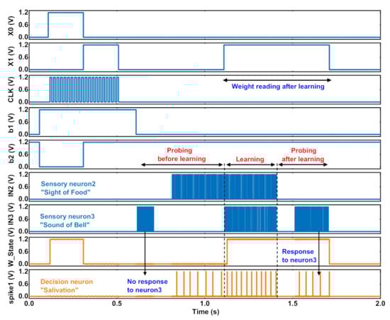 As seen, the time from 0 to 0.6 s represents the initial configuration period of the network prior to experimentation. X0 and X1 are outputs from the row decoder that select the desired synapses in the network as configurations, while CLK, b1 and b2 are configuration signals used to set the attribute and initial weights of the selected synapses (see Section 2.3 for details). Here, the chosen synapses were configured as excitatory through b1. The initial weight of the synapse connected to sensory neuron 2 was set to high by b2 at 0.1–0.3 s, while the synapse connected to sensory neuron 3 was set to low by b2 at 0.3–0.5 s. For sensory neurons 2 and 3, there is the same input stimulus as for the Poisson spike trains at 300 Hz. Before learning, the “salivation” neuron only responded to stimuli from the “Sight of Food” neuron 2. By co-stimulating “Sight of Food” neuron 2 and “Sound of Bell” neuron 3, the synapse between neuron 3 and the decision neuron was potentiated with the SDSP learning algorithm. After learning, when the stimulus from the “Sound of Bell” neuron 3 was used alone, the “salivation” neuron was excited and responded to neuron 3, thus establishing an association between the conditioned (“Sight of Food” neuron 2) and unconditioned (“Sound of bell” neuron 3) stimuli. The weight variation of associative learning was monitored in real-time and recorded as the W_State signal.