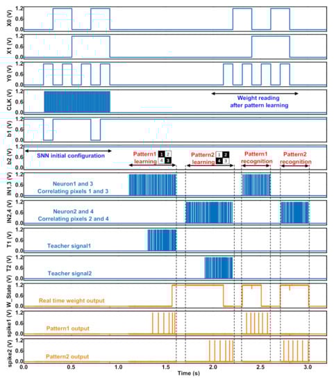 Firstly, pattern 1 is inputted to the network and the output neuron 1 has no response. With the guidance of teacher neuron 1 (a 300 Hz Poisson spike train) and co-stimulation of pattern 1, connections are established between input neurons 1 and 3 with output neuron 1, resulting in a response to pattern 1. This also means that the weights Vw11 and Vw13 (see Figure 6a) are updated from low to high with the SDSP learning algorithm, as can be seen from the weight output signal W_State at 2.0–2.1 s for Vw11 and 2.4–2.5 s for Vw13. Establishing a connection between pattern 2 and output neuron 2 follows the same process as pattern 1. The weights Vw22 and Vw24 (see Figure 6a) are updated from low to high with the SDSP learning algorithm, as can be seen from the weight output signal W_State at 2.3–2.4 s for Vw22 and 2.7–2.8 s for Vw24. After establishing connections between two patterns and output neurons, when the stimulus from pattern 1 was used alone, output neuron 1 was excited and responded to pattern 1. Conversely, while the stimulus from pattern 2 was used alone, output neuron 2 was excited and responded to pattern 2, and the binary classification task was effectively performed using the SNN chip. Integrating multiple SNN chips together enables networks to handle complex application tasks, as demonstrated in previous studies [20,21,48,49,50].