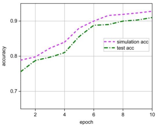 In this design, the indicator for evaluating the classification accuracy of SNNs in binary classification tasks is the change in synaptic weight after SNN training. After training with the standard binary task, the weight distribution of the 4 × 2 synaptic arrays in SNNs is as follows: the synaptic weights between the pre- and post-neurons corresponding to black pixels are at a high level, while the synaptic weights between the pre- and post-neurons corresponding to white pixels are at a low level. To evaluate the classification accuracy of SNNs in binary classification tasks, we applied varying degrees of noise to two patterns (i.e., white pixels were subjected to lower frequency Poisson spike trains, ranging from 10 Hz to 50 Hz), and the two patterns were divided into 5 groups for a 10-training epoch. After each epoch, the weight changes of 4 × 2 synaptic arrays in the network are counted and compared with the standard synaptic weights. After training, the accuracy of the binary classification network can be evaluated by determining the proportion of synaptic weights in the network that are the same as the standard synaptic weights. Figure 12 presents the binary classification accuracy versus training epoch statistics for the SNN, comparing simulation and testing results.