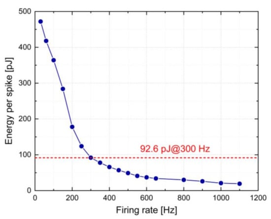 where Energy is the product of average power consumption (Pave) and excitation time (Time) that is represented as (Pave·Time), and Freq is the spiking frequency. Figure 13 illustrates that the energy per spike declines from hundreds of pJ for lower frequencies to tens of pJ for higher frequencies (as reference at 92.6 pJ@300 Hz). This occurs as inverters operate at higher levels of gain in the lower frequency range, owing this to a slower charging of the membrane voltage Vmem input when compared to higher frequency operation.