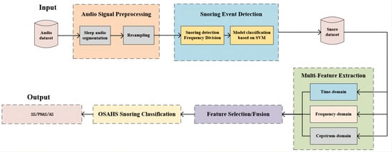 When investigating snoring event detection, there are two primary methodologies: multi-stage and single-stage methods []. The approach of this section to snoring detection falls within the category of multi-stage detection, which comprises three pivotal stages: audible segment detection, feature extraction, and snoring detection.