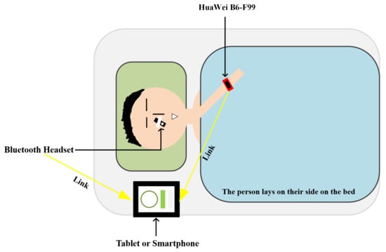 The data acquisition system and data acquisition environment for this study are shown in Figure 2. Sleep breathing sound signals are captured via portable wearable collection devices for quality sleep acquisition, which include a smartphone or tablet with Android and a wireless microphone. Our study aimed to develop an inexpensive and easy-to-use home sleep monitoring system, so using a commercial wireless headset (PTM165) as well as a commercial wristband (HUAWEI B6-F99) became a better choice for our study. To ensure that a steady breathing signal is obtained throughout the sleep period, a microphone is fixed near the nose using a medical tape [,]. The bracelet is worn on the wrist in the position of the pulse, and blood oxygen saturation, as well as rough sleep staging, can be obtained throughout the night. The raw sampling rate is 22.5 kHz, 16 sampling bits, and mono. The data were collected from both healthy male and female participants as well as OSAHS patients during the experiment, totaling over 300 h of recordings.