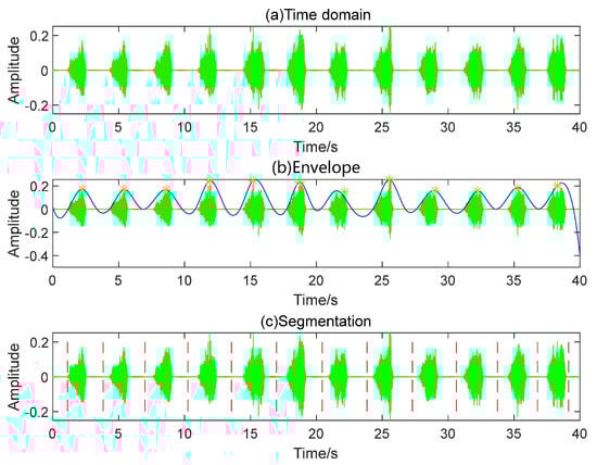 - Step 2: Utilize the envelope function to extract the waveform’s envelope, selecting “peak” as the function’s argument. Subsequently, employ the “find-peaks” function to locate the envelope’s peaks. The peak interval threshold is set to 5/2*fs, where fs represents the audio sampling rate.