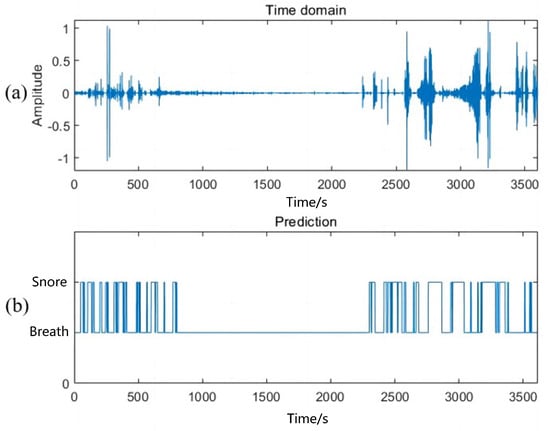 One hour of snoring detection. (a) time-domain diagram, (b) predictive label diagram.