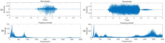 In Figure 6, panels (a) and (b) depict the time and frequency domains of normal snoring sounds, while panels (c) and (d) represent those of OSAHS snoring sounds. The discrepancy between the frequency domains of the two types of snoring sounds is readily apparent. It can be noted that significant information pertaining to OSAHS snoring sounds extends beyond 1000 Hz. As a result, we are led to extract features related to the spectrum to enable the classification of diverse snoring sounds.