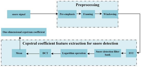 The concept of snore detection division is a novel approach, inspired by both uniform and non-uniform divisions. It has been established that snore detection frequency division surpasses other tripartite frequency division methods in the binary classification of snore/breath sounds. As such, we replace the Mel-triangle filter bank with a snore-detection triangular filter bank for coefficient extraction. The steps of Snore Detection Cepstral Coefficient (SDCC) extraction are illustrated in Figure 7.