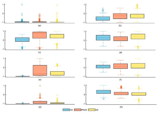 Box plot of spectral features for three speech types: (a) spectral entropy, (b) spectral centroid, (c) spectral spread, (d) spectral flatness, (e) spectral roll-off point, (f) spectral skewness, (g) spectral slope, (h) PR800.