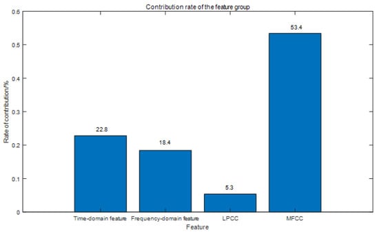 The contribution rates of different features to the classification task for the 51-dimensional dataset are shown in Figure 11. The breakdown indicates that time-domain features account for 22.8%, frequency-domain features constitute 18.4%, LPCC represents 5.3%, and MFCC comprises 53.4%.