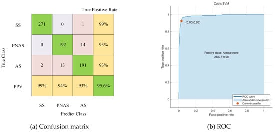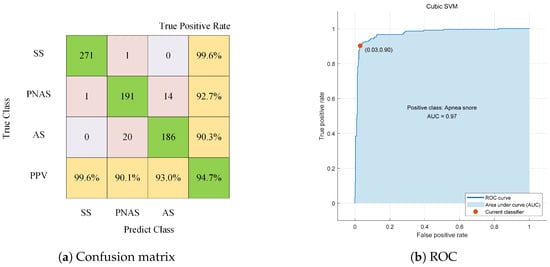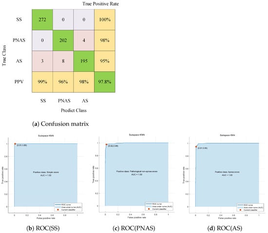The 26-dimensional feature set, with Cubic SVM as the reference classifier, exhibits a distinct advantage in the two categories of snoring sounds in OSAHS patients. The overall accuracy exceeds that of the 30-dimensional feature set. The subspace KNN for this feature set yields the best results, further enhancing the sensitivity and specificity of binary classification, as shown in Figure 14.