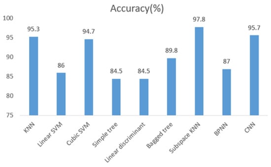 Utilizing only a pair of classifiers does not sufficiently demonstrate the versatility of the proposed methods. As a result, we supplemented our experiment with other classifiers, including K-nearest neighbor, linear SVM, decision tree, linear judgment, bagged decision tree, BPNN (Back Propagation Neural Network), and CNN. These classifiers were trained using features derived from the five proposed methods. The final accuracy results are presented in Figure 15.