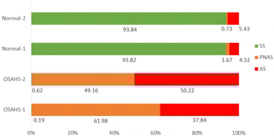 We fed the 26-dimensional feature set into the Subspace KNN for training and model generation. The model was then utilized to identify OSAHS using the sleep acoustic signals of an entire night from four subjects. Figure 16 and Figure 17 show the results for four data samples. Specifically, OSAHS-1 has an AHI value of 16, classifying it as a moderate level, while OSAHS-2 has an AHI value of 30, placing it in the severe category. Figure 16 depicts the proportion of three types of snoring across each case. In contrast, Figure 17 illustrates the specific number of events, highlighting the recognition results of various snoring sounds across the individual cases.
