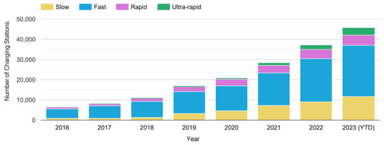Since the beginning of the 21st century, there has been an increasing recognition of the imperative to solve greenhouse gas emissions and environmental pollution stemming from the heavy reliance on fossil fuels [1]. Consequently, renewable energy sources have gained significant prominence and are now widely acknowledged as primary energy alternatives in numerous countries worldwide. It is noteworthy that the electricity generation and transportation sectors are major contributors to carbon dioxide emissions, accounting for approximately 64% of the total emissions [1]. This has sparked considerable public concern regarding the irreversible environmental consequences associated with such emissions. As emphasized in [2], the integration of renewable energies is indispensable for achieving the necessary reduction targets in carbon dioxide (CO2) emissions in the domains of electricity generation and transportation. Electric vehicles (EVs) have emerged as one of the viable solutions for curbing CO2 emissions. Extensive reviews of existing studies on EVs [3,4] have revealed that the adoption of these vehicles delivers evident societal benefits in terms of environmental impact, as well as economic advantages for EV purchasers through reduced operational expenses. However, the development of EV charging infrastructure has remained a significant hurdle in stimulating higher rates of EV adoption. Ref. [5] highlights that the growth of charging stations (CSs) for EVs has been relatively sluggish, thereby impacting the willingness of potential users to purchase EVs. Correspondingly, Ref. [6] attributes the slow progress of EV charging infrastructure to the substantial investment costs faced by infrastructure developers, compounded with the uncertainties surrounding EV demand. Figure 1 and Table 1 show the evolution of these four categories of charging stations (slow, fast, rapid and ultra-rapid) throughout the years. In the case of London, projections indicate a need for over 500,000 charging points in the city and its environs by 2040, with nearly 50,000 charging points required in public locations [7].