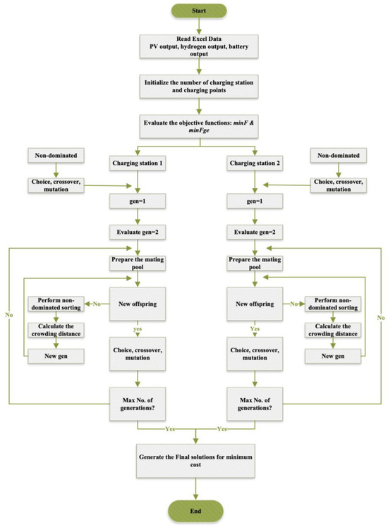 The flowchart of SHS-EV charging station using NSGA-II optimization.