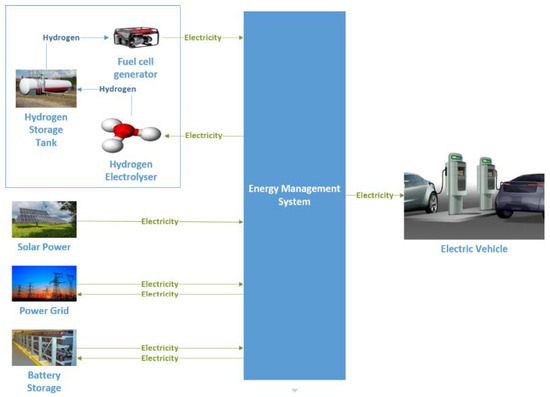 Considering the unpredictable and often cloudy weather conditions in the UK, it becomes apparent that relying solely on photovoltaic energy may not be sufficient to meet the demands of EVCS. Additionally, while battery technology has made significant strides, the cost of batteries still presents a significant challenge for widespread deployment and scalability. Considering these factors, hydrogen emerges as a promising alternative among renewable energy options. Its versatility and ease of transport make it an attractive choice for urban settings [32]. Hydrogen energy storage stands out due to its remarkable energy storage density. The use of hydrogen energy storage not only enhances energy resilience but also offers a means to balance the grid by providing a stable and on-demand energy source when needed. This innovative solution represents a vital step towards reducing greenhouse gas emissions, fostering cleaner transportation options, and building a more sustainable energy infrastructure, for the future, into hydrogen through a process like electrolysis and then stored for later use.