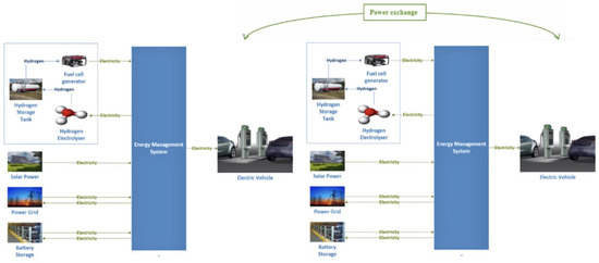 - Duan, L.; Lai, C.S.; Taylor, G.; Zhang, X. Optimal energy exchange of two electric vehicle charging stations with solar-hydrogen-battery storage systems. In Proceedings of the 2023 58th International Universities Power Engineering Conference (UPEC 2023), Dublin, Ireland, 29 August–1 September 2023. [Google Scholar]