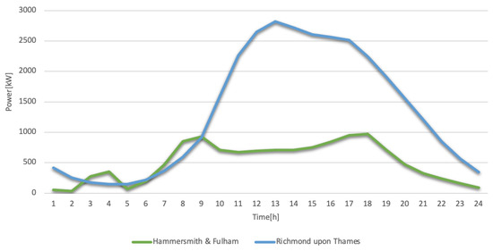 Figure 7 presents the projected profile of EV charging demand, commonly referred to as the load curve, within the SHS-EVCS across two specific boroughs in London. Each EV charging load curve corresponds to a distinct SHS-EVCS. It is assumed that Hammersmith and Fulham will have 5 SHS-EVCSs, while Richmond upon Thames will have 14, based on the existing number of petrol stations within these respective boroughs [46]. Among these stations, Richmond exhibits the highest EV charging load, reaching a peak value of 2.8 MW. To accommodate this peak charging load, eight chargers are required within the charging stations. This calculation is based on the assumption that a 360 kW charger is necessary to charge an EV equipped with a 60 kWh battery. Consequently, by employing eight chargers, the peak charging load in Richmond can be adequately managed. Conversely, the SHS-EVCS in Hammersmith and Fulham experiences the lowest charging load, remaining below 1000 kW. Accordingly, three chargers with a capacity of 360 kW each are deemed sufficient.