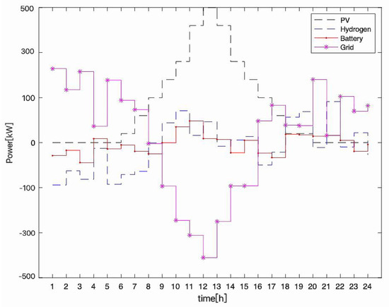 Figure 8 shows that solar energy plays a dominant role as the primary energy source between 7 am and 7 pm, with a maximum capacity of 500 kW. This heavy dependence on solar power emphasizes the importance of utilizing this renewable energy source to meet the energy demands necessary for charging EVs at the SHS-EVCSs during this specific time frame. To ensure a reliable and consistent energy supply throughout these hours, the charging station integrates both hydrogen energy storage and electric energy storage systems, working in synergy to effectively meet the changing requirements throughout the day.