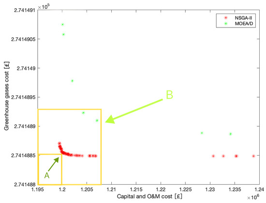 Figure 13 demonstrates point A is the Utopia point, and the B area is the Pareto front with valid Pareto optimal solutions. The superior performance of NSGA-II over MOEA/D is evident in this research paper. The effectiveness of NSGA-II is evident, as it outperforms MOEA/D in terms of optimization objectives, particularly in achieving better cost outcomes. The results indicate that NSGA-II offers a more efficient and effective approach to optimization compared to MOEA/D, making it a favourable choice for the given objectives.
