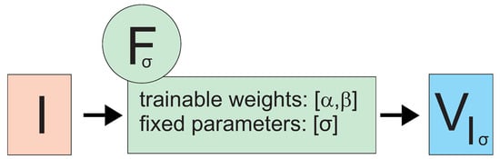 where ⌊ ⌋ is the rounding down operator. This fact causes, in the case of processing data in a single instruction multiple data pipeline, parameter to become troublesome because the implementation of the convolution filter, e.g., in Tensorflow, requires a predefined filter window size. For this reason, the Frangi neuron architecture proposed in this work has a fixed value of that is not subject to optimization. Parameters and are threshold values for blob-like structures and the second-order structureness ratio. They are easy to optimize because changing them does not change the structure inside the neuron. The values of and must be different from zero and there is no point in considering their negative values. Since they are arguments of the denominator of the exponent of the exponential function, there is a certain range of values in which they affect the performance of the filter. For this reason, we impose constraints in the optimization process: and . Outside this range of values, the Frangi algorithm may become stuck in the local minimum. The Frangi neuron diagram is shown in Figure 1.