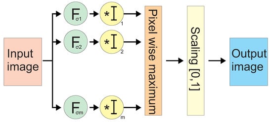 The computations performed in a loop of Algorithm 1 that uses different values of from the set are independent of each other and can be performed in parallel. Only the last operation aggregates the partial results via element-wise (pixel-wise) maximum. This fact can be used to build a parallel neural network architecture inspired by the performance of Frangi’s original algorithm.