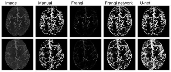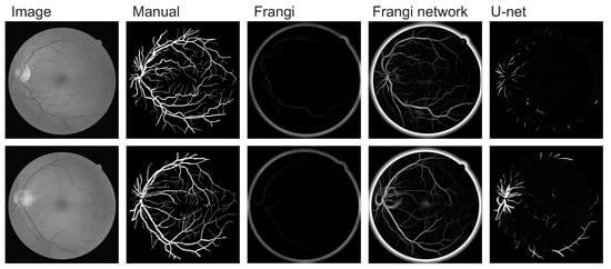 Weobtained the U-net implementation from the GitHub repository, https://github.com/jocicmarko/ultrasound-nerve-segmentation (Access date: 4 September 2023). This source code is available under the MIT licence. Both the Frangi network and the U-net were trained on a single image in the training set at 200 epochs. We repeated the training on every single image in the set, and then the remaining images were used to test the results. For training purposes, we used the Adam optimizer [37,43] with a learning rate equal to and a batch size equal to 16. In all cases, only one image was used for training, and the rest wete used for validation (one-shot learning). We applied cross-validation, so after the Frangi network and the U-net were trained and validated, the network weights were randomly initialized, and another image was selected for training and the rest of the dataset was selected for validation. We performed 20 trainings and validations for the retina dataset, 4 trainings and validations for the artery dataset and 5 trainings and validations for the brain dataset. The quality of segmentation was evaluated using the Area Under the Receiver Operating Characteristic Curve (ROC AUC) measure, which is an appropriate metric for evaluating this type of task. We used the scikit-learn 1.0.2 package for this. Our implementation and the data used are presented in the https://github.com/jocicmarko/ultrasound-nerve-segmentation (accessed on 4 September 2023). The calculations were performed on Intel Core i7 3.00 GHz CPU, 64 GB RAM, NVIDIA GeForce RTX 2060 GPU, Windows 10 OS.