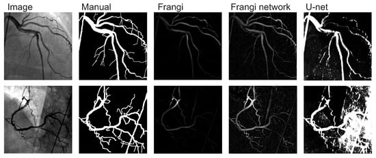 The second dataset contains four X-ray coronary angiography images [41]. The images show blood vessels of various sizes. A high level of background noise as well as the blood vessels themselves are evident. A manual segmentation is provided for each image. Since there is no distinction between training and test set, training on this set is performed by selecting its subset to be used in training. In terms of image quality as well as diameter variation, this dataset is much more difficult to segment than the retina one.