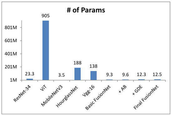 Figure 1 shows the number of model parameters of FusionNet and the backbone networks commonly used in vision tasks. We can see that FusionNet is very lightweight despite the state-of-the-art performance shown in the previously presented results. Compared to ResNet-34, which is the most popular backbone, FusionNet has nearly 2× fewer model parameters even after fusing the Transformer (GDE). This efficiency stems primarily from our CNN blocks replacing ResNet blocks. In addition, despite significant contributions to FusionNet’s performance improvement, the attention block and GDE slightly increased the model parameters. Compared to ViT, FusionNet has nearly 75× fewer model parameters, which demonstrates the efficiency of FusionNet for practical use under real-world conditions.