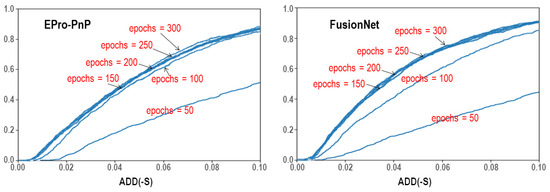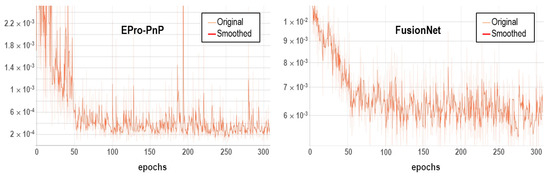 To ensure that the models were properly trained, the training errors over the number of epochs are visualized in Figure 6. In addition, to verify their generalization capabilities, the validation accuracies are visualized in Figure 7. For both EPro-PnP and FusionNet, the rate of decline decreased, but the training errors decreased steadily. The validation accuracies also steadily increased as the number of epochs increased. This means that the models were properly and sufficiently trained with good generalization capabilities. In terms of the training speed, FusionNet with the Transformer architecture was slower than EPro-PnP.