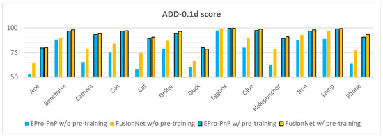Table 3 shows object-wise ADD-0.1d scores of FusionNet. Although object-dependent, each modification had a positive effect on most objects, and Final FusionNet, which included a combination of three modifications, received significantly higher ADD scores than EPro-PnP for all objects. The degree of improvement can be observed more clearly in Figure 8. The tendency has hardly changed with or without pre-training except for “Duck” and “Eggbox”. However, we observed a difference in the overall dependence of each model on pre-training. For each object, the ADD scores significantly increased with pre-training. However, FusionNet had a weaker dependence than EPro-PnP, which is good for the practical use of the model. In fact, the pre-training is tedious and time consuming, particularly in our pre-training process where the model needs to be pre-trained twice using the ImageNet and LINEMOD datasets.