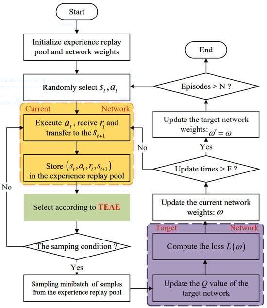 where and are the network parameters of the target network and the current network, respectively. Furthermore, in the DQN-PER-TEAE algorithm, the rule for updating the Q value of the target network is: if episode terminates at time step , then update according to Equation (16), otherwise update according to Equation (17), where represents the action candidate set in state . The formula for calculating the Q value of the current network is shown in Equation (18).