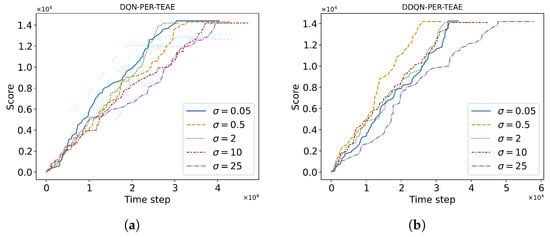 The influence of on the algorithm. Subfigure (a) and subfigure (b) respectively demonstrate the scores of DQN-PER-TEAE and DDQN-PER-TEAE under different values in the Kungfu Master game environment.