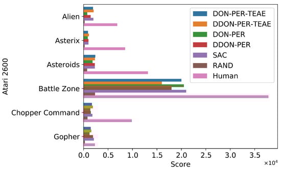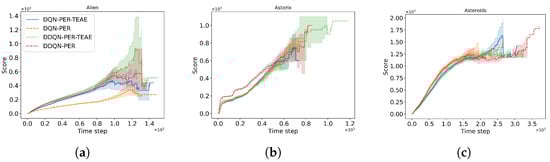Figure 4 presents the training scores recorded for the four algorithms across 400 epochs. Each curve represents the scores at each time step within aepoch, with the solid line indicating the average score over the 400 epochs and the shaded area representing the 95% confidence interval obtained from 400 independent operational epochs. The results demonstrate the exceptional performance of the TEAE-based algorithms in the selected Atari 2600 games. These algorithms outperformed the annealing-based -greedy algorithm in four games and achieved comparable performance in the remaining two games, Asteroids and Battle Zone (Figure 4c,d). Moreover, both the DQN-PER-TEAE and DDQN-PER-TEAE algorithms exhibited significantly improved convergence speed. In the Alien, Asterix, Asteroids, and Battle Zone games (Figure 4a–d), the score curves displayed notable fluctuations. However, in the Chopper Command and Gopher games (Figure 4e,f), the score curves were relatively stable, with the Chopper Command game converging to an almost flat line. In the Gopher game, the score curve continued to rise. Despite these observations, the DQN-PER-TEAE and DDQN-PER-TEAE algorithms exhibited smoother score curves and narrower confidence intervals compared to the DQN-PER and DDQN-PER algorithms. This suggests that TEAE exhibits remarkable robustness and has the ability to enhance the robustness of benchmark algorithms.