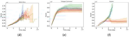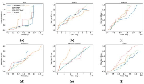 Standard scores curve. After 400 epochs of training the agent, the four algorithms were evaluated on a single epoch of testing. The game scores obtained were standardized using Equation (25). The figure includes the scores for the following games: (a) Alien, (b) Asterix, (c) Asteroids, (d) Battle Zone, (e) Chopper Command, and (f) Gopher.