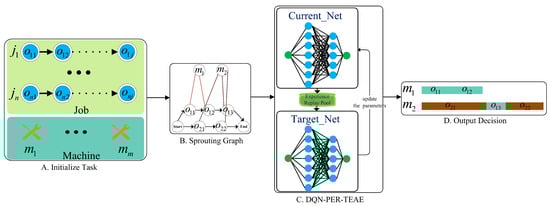 In this section, solving the FJSP is regarded as a sequential decision-making process. It iteratively takes scheduling actions, assigning an operation to an available machine, until all operations are processed. The workflow of the proposed method is depicted in Figure 7. In each iteration, tasks are initially initialized and transformed into a graph structure. Subsequently, the graph is inputted into a multi-layer deep convolutional neural network (DQN-PER-TEAE or DDQN-PER-TEAE) to extract features of operations and machines. These features are then utilized to generate a probability distribution of actions, ultimately yielding the optimal scheduling operation.