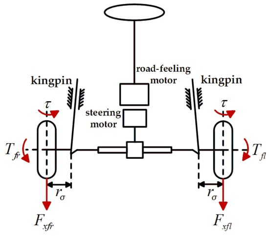 Considering that the wheel angle is small, since this paper only studies the front wheel’s differential steering, the rear wheel’s driving force is the same, so Equation (1) can be simplified as follows:
