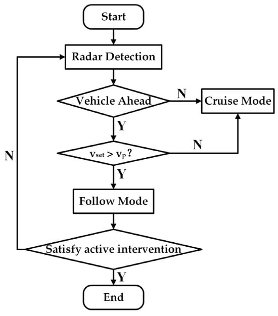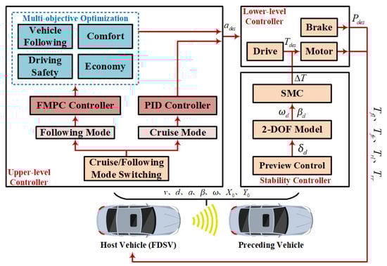 Figure 4 shows the architecture of the ACC system control strategy of the DSV proposed in this paper on curved roads. The ACC system control strategy is made up of an upper-level controller, lower-level controller and lateral stability controller. Firstly, the upper-level controller selects the appropriate system working mode through the mode switching strategy according to the driving state of the two vehicles. For the cruise mode, a proportion integral differential (PID) control strategy is designed to obtain the desired acceleration. Aiming at the selection of the following mode, the upper-level control algorithm of the multi-objective ACC system with a variable weight is designed under the FMPC framework. Four performance indexes, following, safety, comfort and economy, are defined, and the constraints of the system are designed. The weights of following, comfort and economy are adjusted in real time to obtain the optimal acceleration.