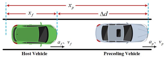 Define ; is the actual distance, is the speed of host vehicle, is the relative speed, is the acceleration of the host vehicle, is the host vehicle’s acceleration change rate, is the desired acceleration of the host vehicle, is the systematic disturbance, and is the error of the inter-distance.